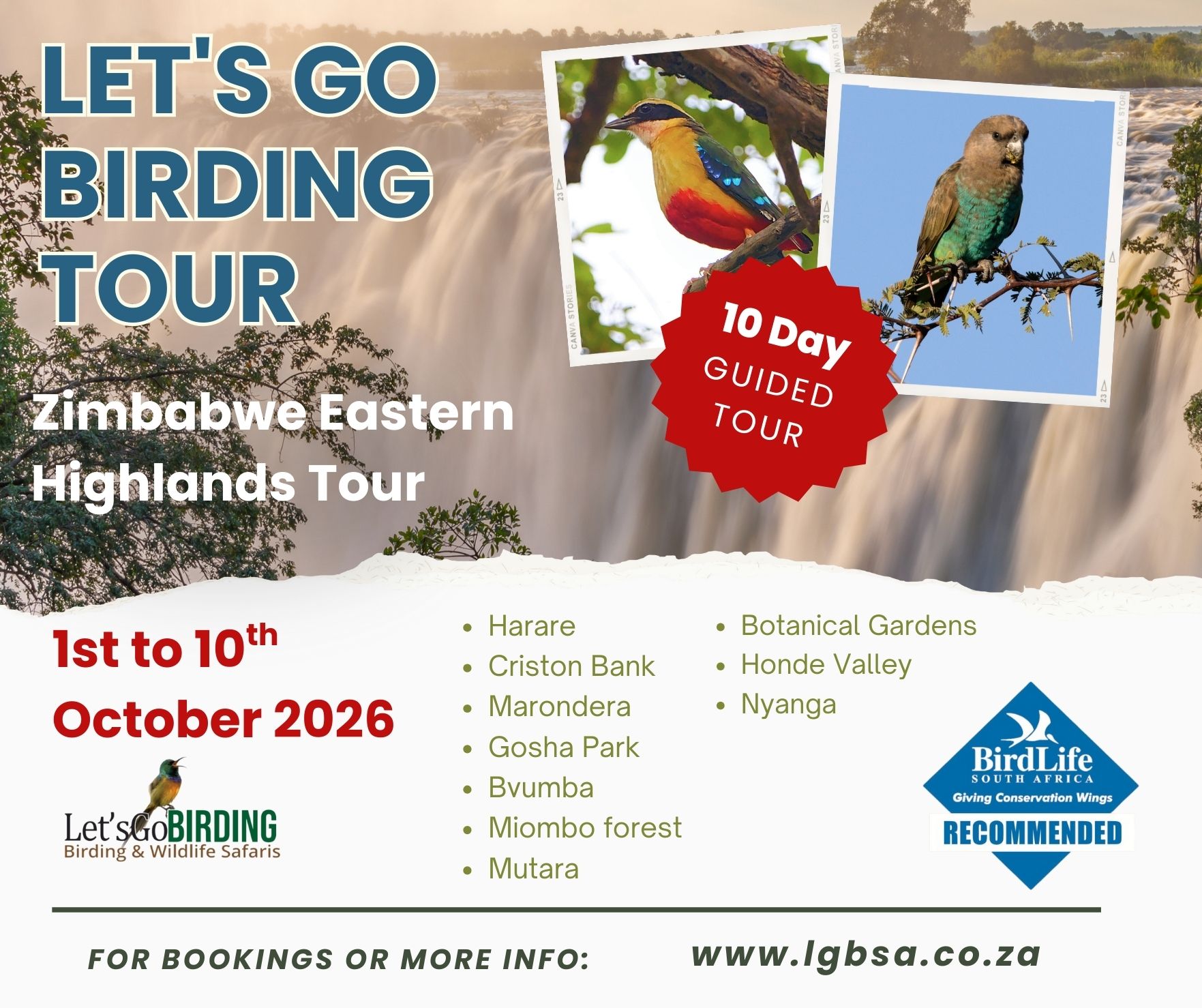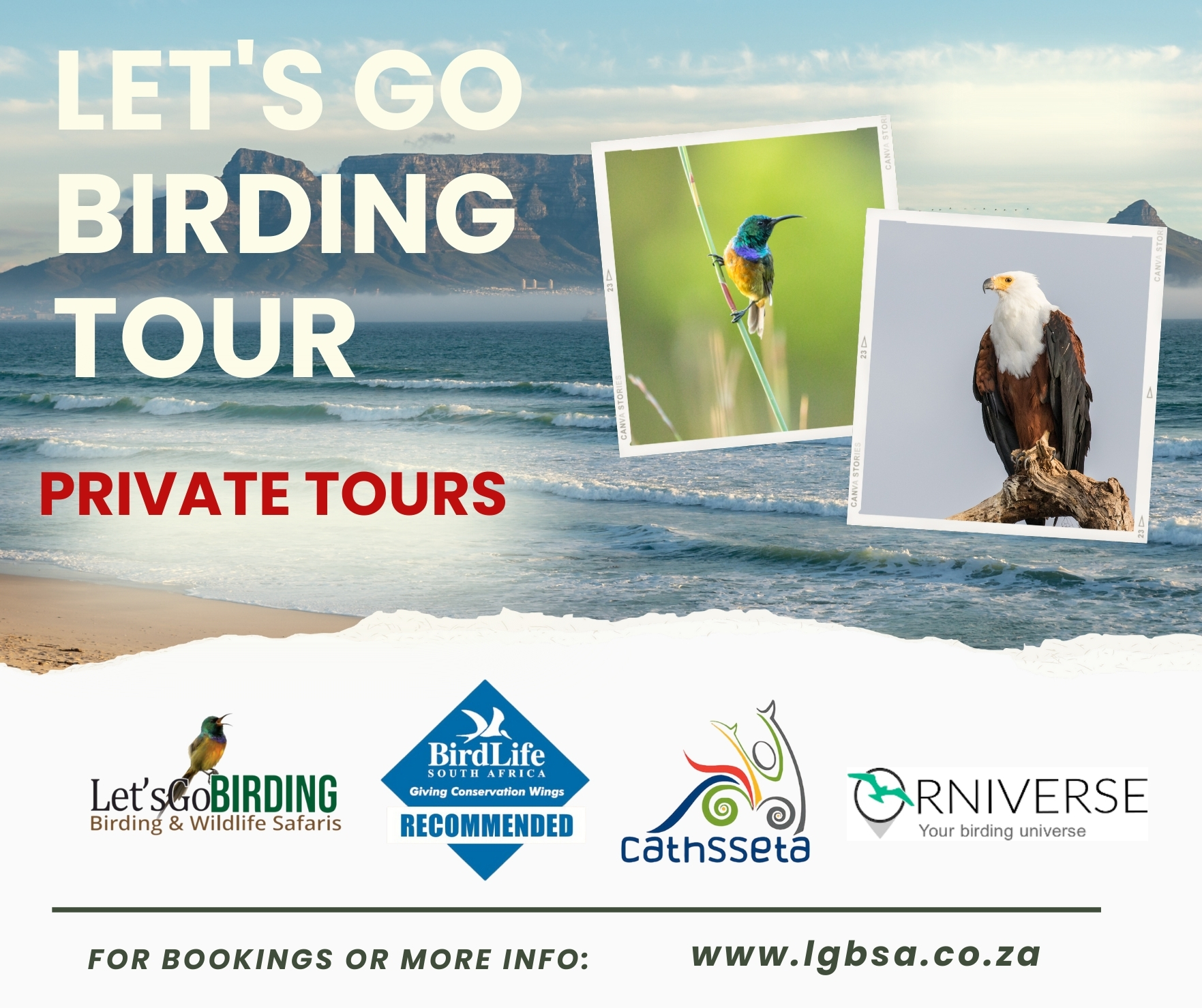 Let’s Go Birding offers expertly guided group and private birding tours designed to suit birders of all levels, from first-time enthusiasts to seasoned listers and international twitchers. Our tours span all nine provinces of South Africa, including iconic destinations such as the Western Cape, Kruger National Park, Sani Pass and Namaqualand (with seasonal flower and birding tours), as well as select international birding destinations across Southern and East Africa—including Namibia, Botswana, Zimbabwe, Mozambique and Uganda—and further afield to Costa Rica. Each itinerary is thoughtfully custom-designed to match your birding goals, budget and time frame, with careful route planning to minimise travel time and maximise time in the field. Whether you choose a sociable small-group experience or a fully private, tailor-made tour, Let’s Go Birding delivers safe, seamless and immersive birding journeys that focus on quality sightings, meaningful lifers and unforgettable encounters with birds in their natural habitats.
